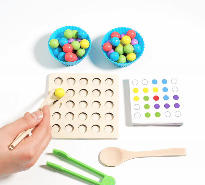 Mit verschiedenen Werkzeugen wie Pinzetten und Löffeln müssen die bunten Kugeln richtig sortiert und nach den Vorlagen auf den Karten angeordnet werden.