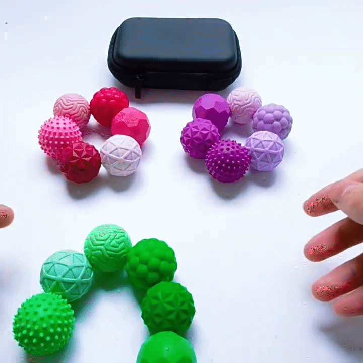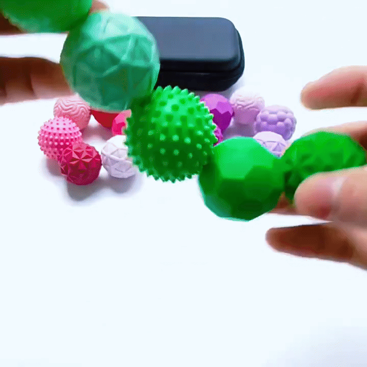 Die magnetischen Sensorikbälle bieten genau diese Art von beruhigendem, taktilem Feedback: Durch das Greifen, Drücken, Formen und magnetische Verbinden entsteht ein gleichmäßiger Rhythmus, der das Nervensystem entspannt, die Aufmerksamkeit kanalisiert und Stress spürbar reduziert.